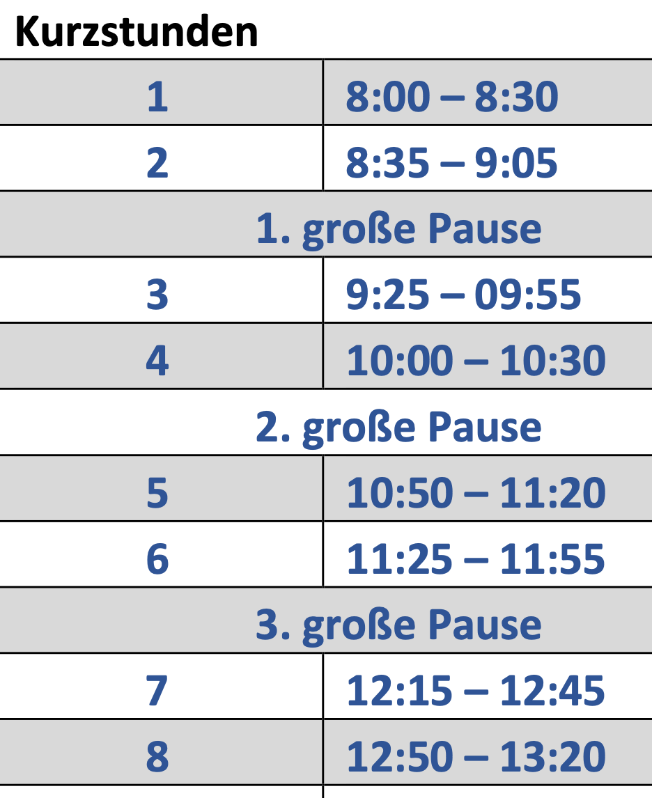 Wegen der erhöhten Anzahl an Krankmeldungen unterrichten wir ab morgen bis zum 30.01.2025 nach dem Kurzstundenplan.